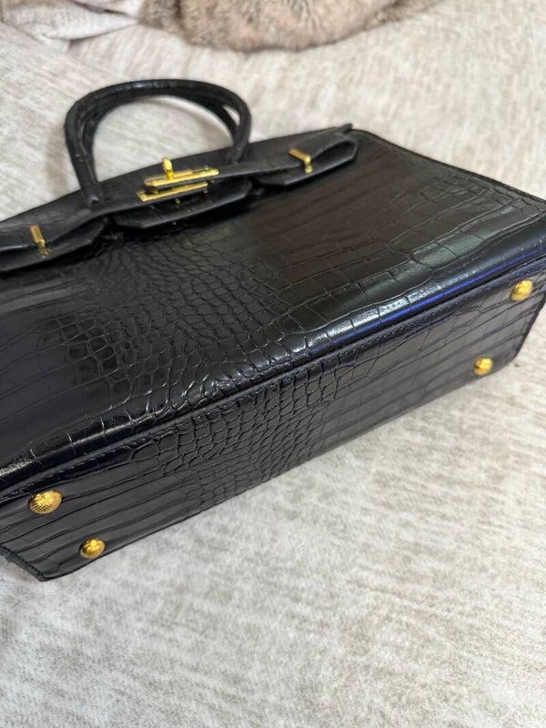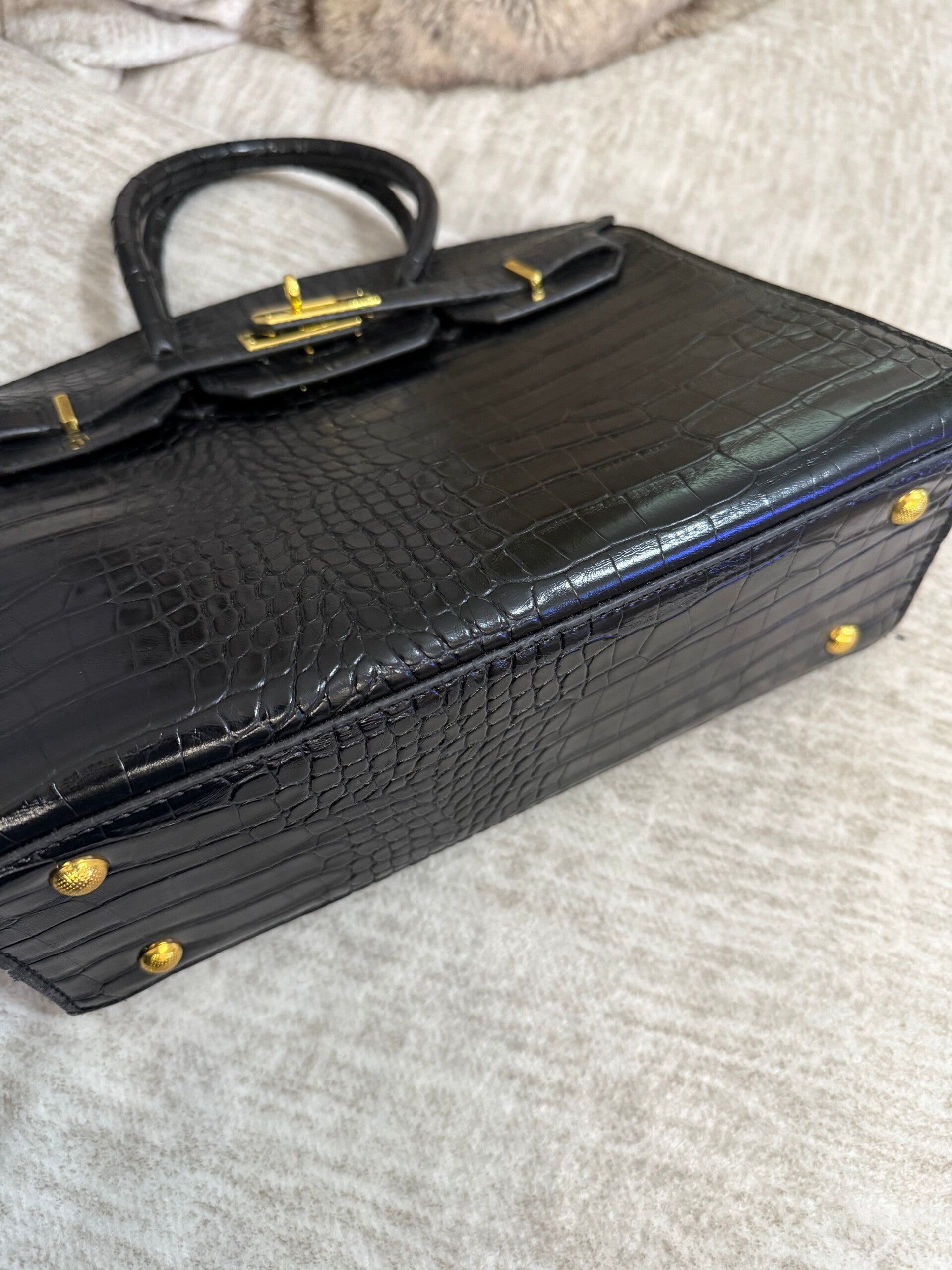 Black sophisticated Birken style bag. Gold hardware and bottom feet.
