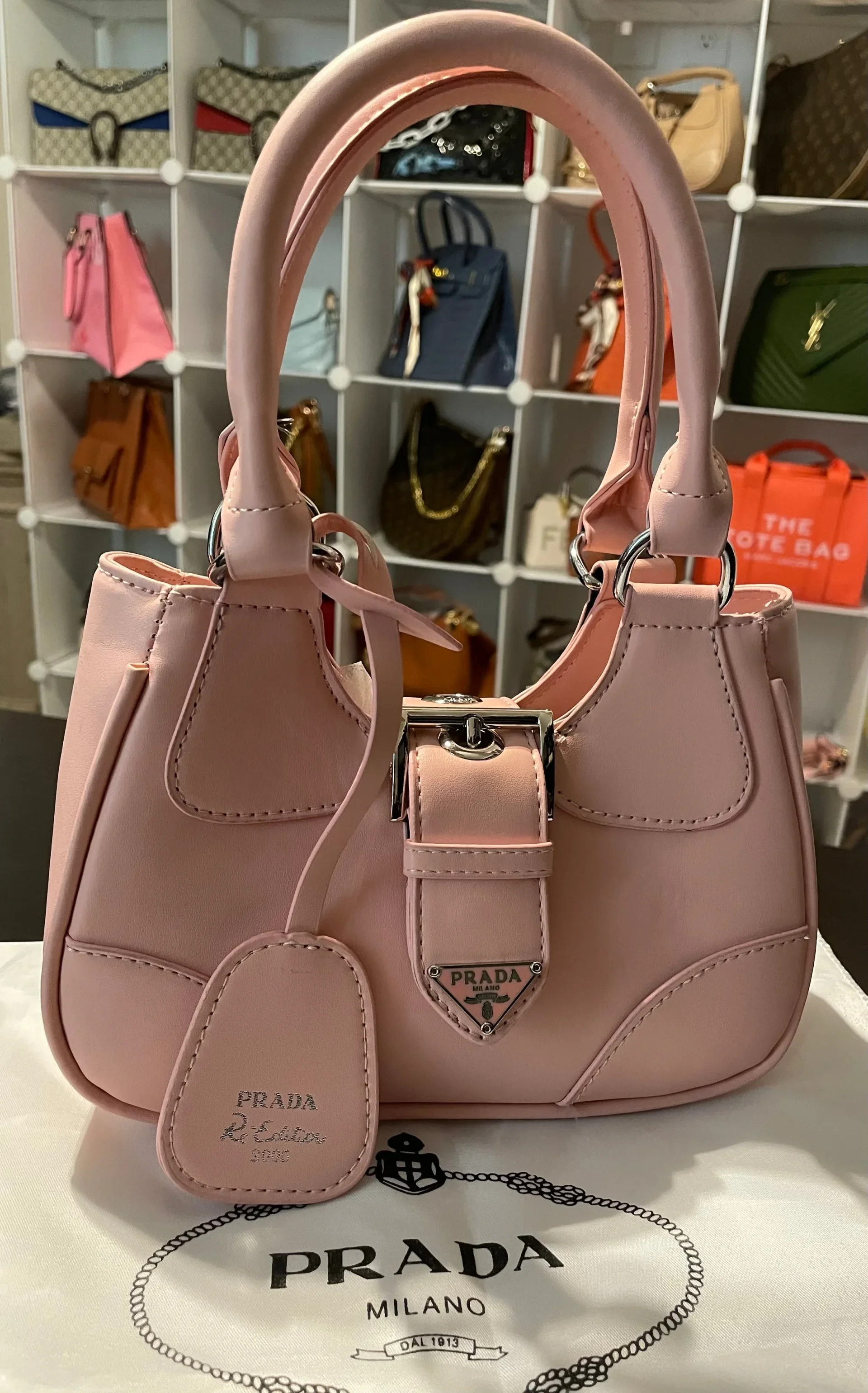 Pink. Has ton-sur-ton triangle logo that frames the letting logo, creating a three-dimensional and material game and enriching the design of the accessory