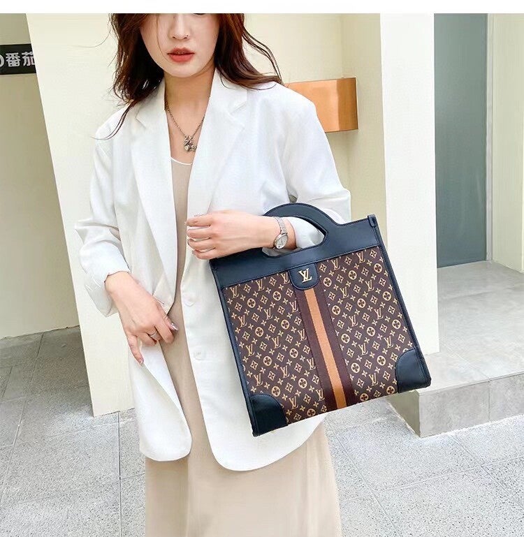 Black and brown tote. Carry by handle. Comes with dust bag.