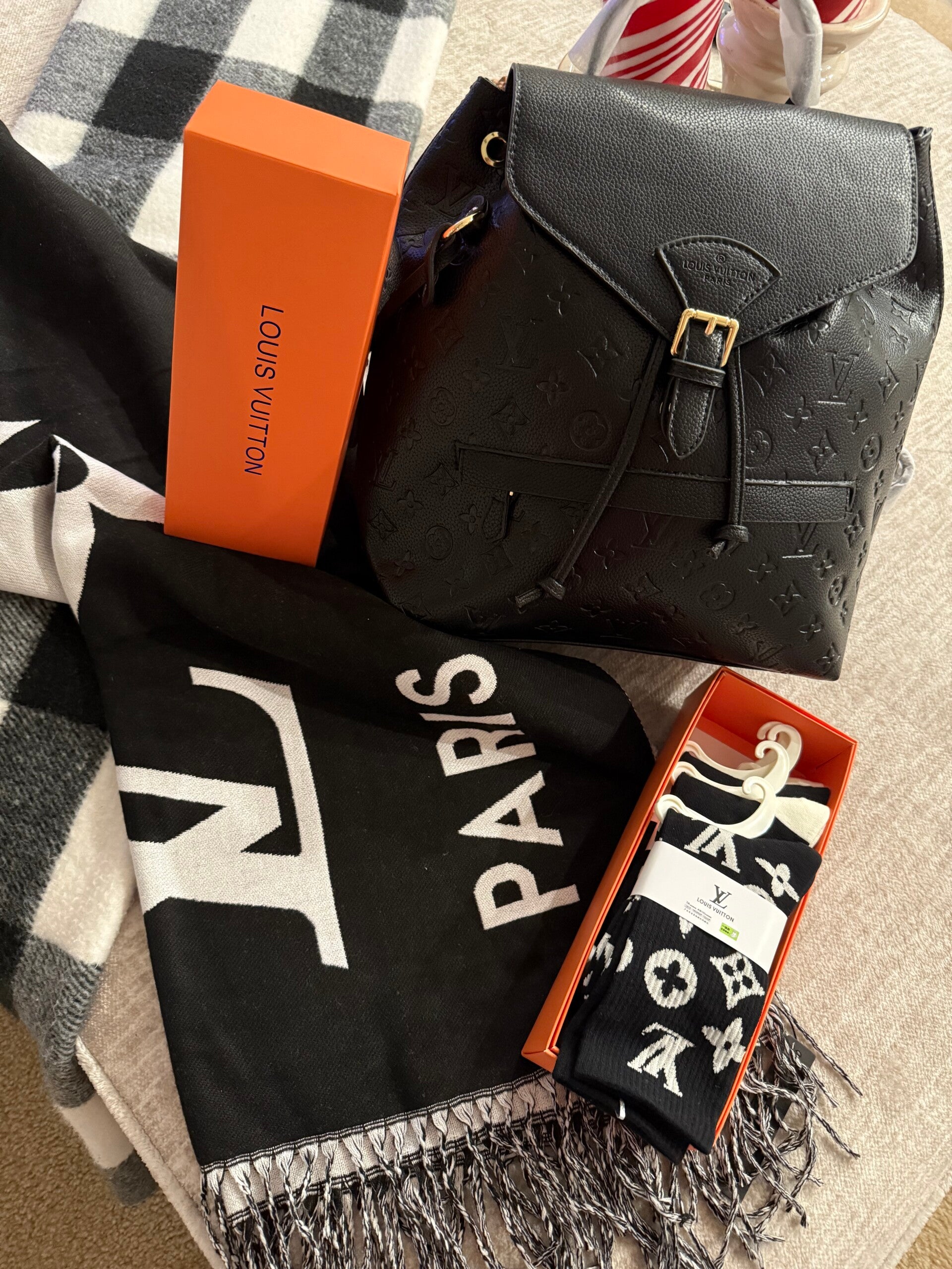 This three-piece set comes with a backpack, a box of socks (5) pair and a cashmere scarf