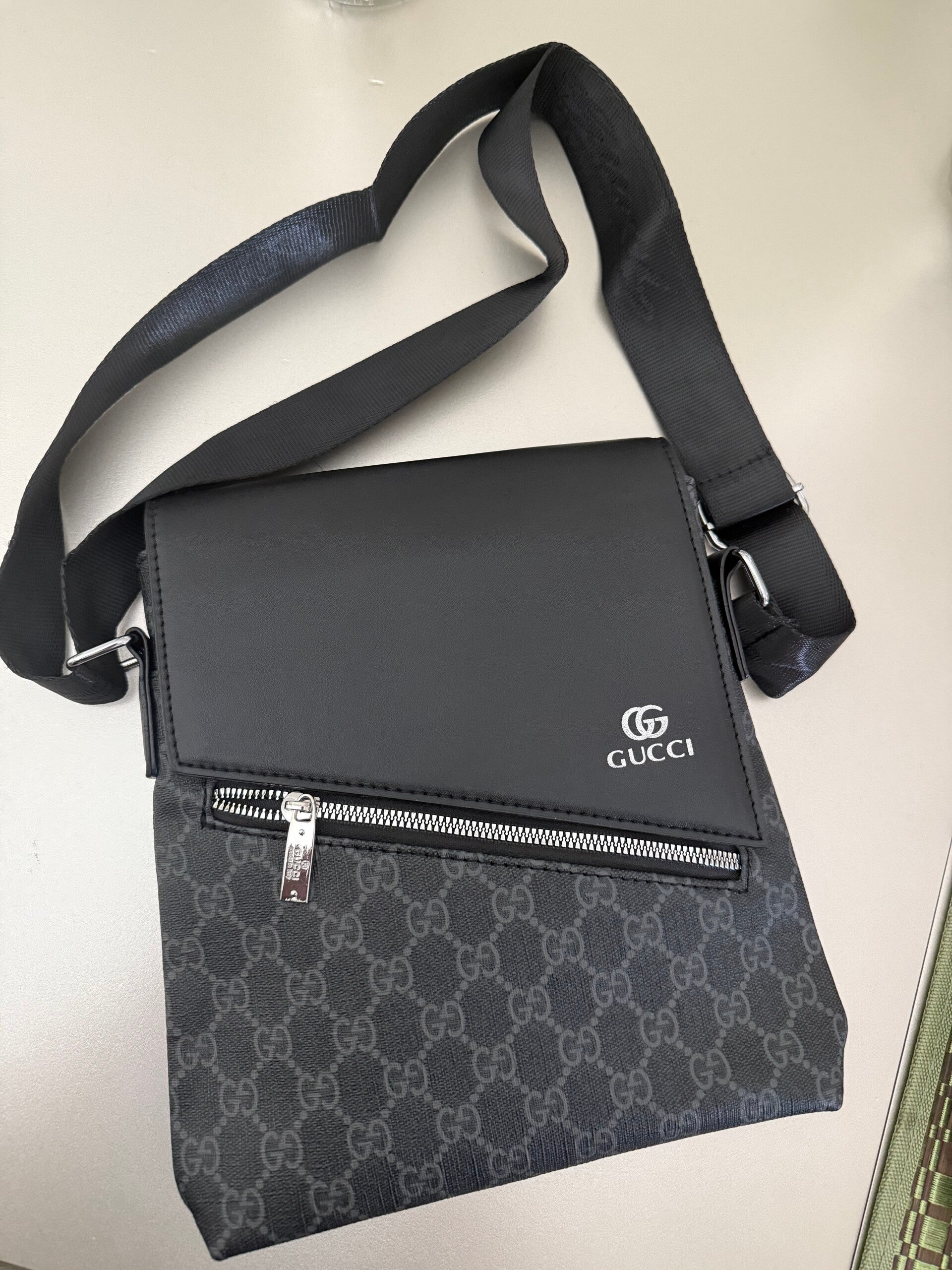 Men's or unisex chest bag with adjustable strap. Has 3 compartments. Comes with dust bag.