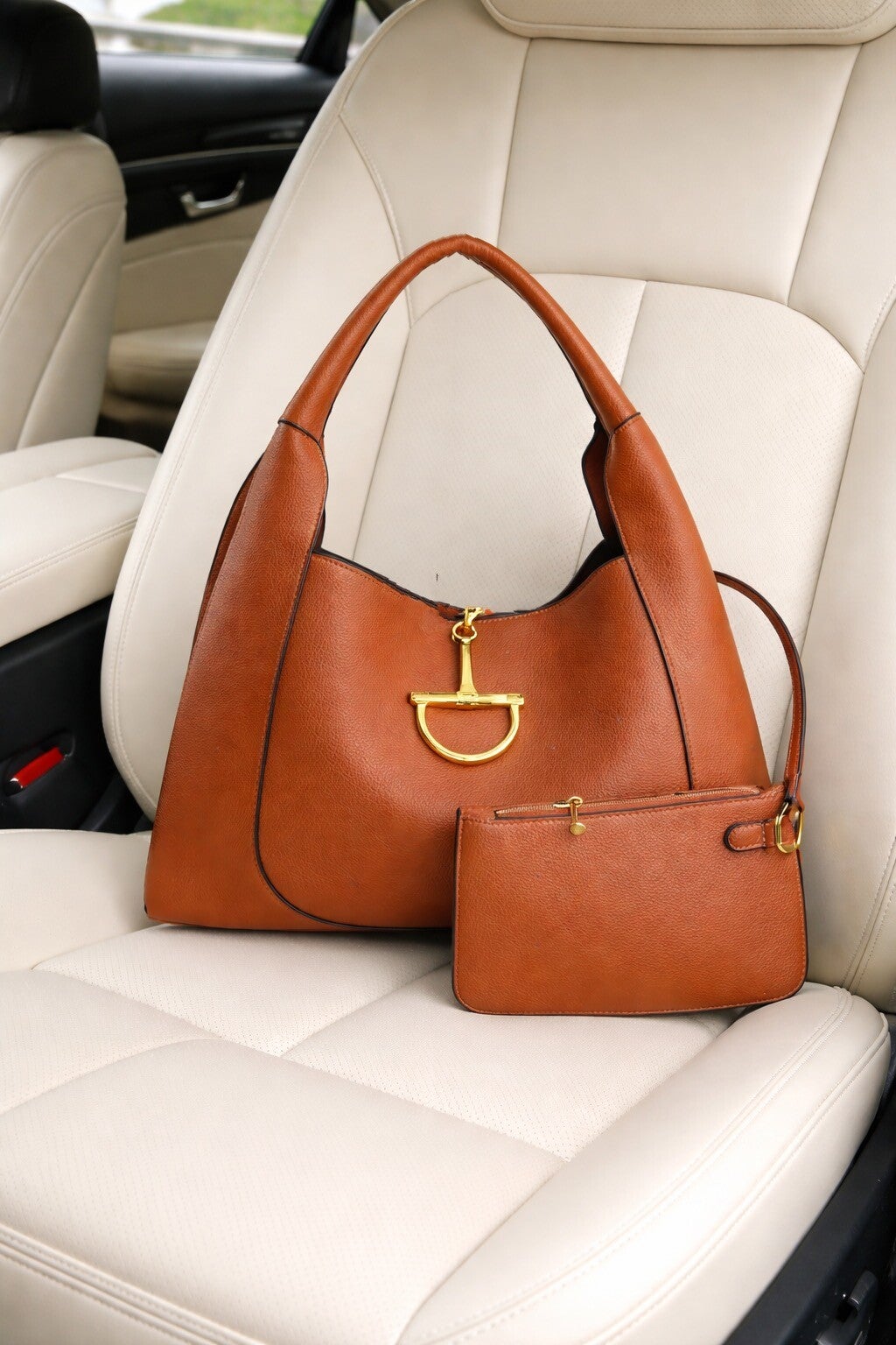 This 2pc tobacco color bag is too chic to pass up. Comes with a dust bag.